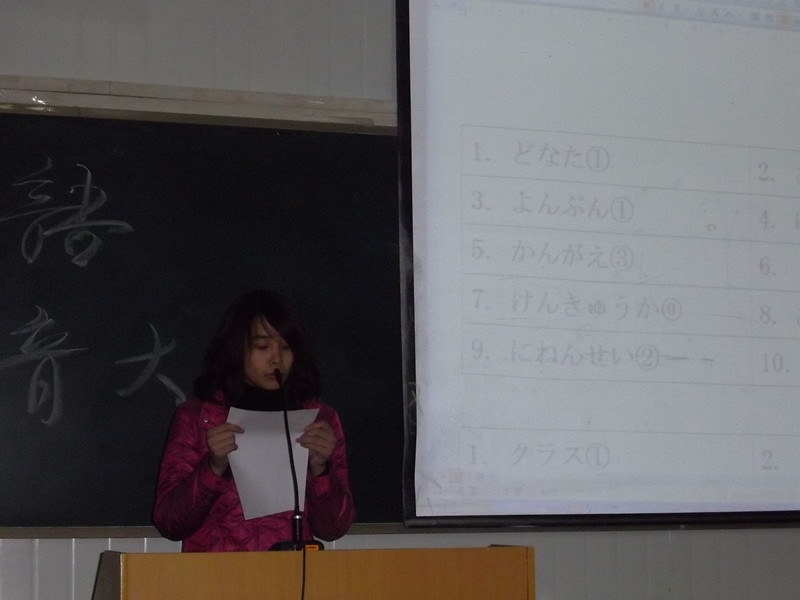 为了培养我系日语专业大一学生的学习兴趣,锻炼和提高他们的日语发音和口语表达能力,在系领导的关怀和指导下,在日语专业雷娟红老师和学生的精心策划和准备下,我系于12月13日晚上在6406教室举办了“首届日语发音比赛”。参加本次比赛的选手皆为大一日语专业新生,日语专业教师赤松秀夫、张琴芳、陈玉平、雷娟红、肖雯、刘婷作为评委出席了本次比赛。另外本专业大二、大三的部分同学也参与了这次活动。