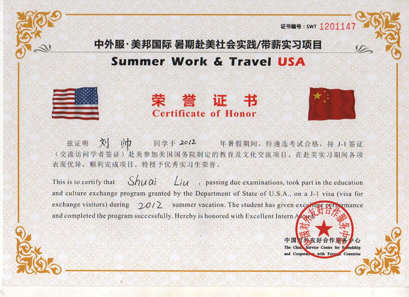 今年6月,我系选派了英语2009级刘帅、孔若曦等两名同学,参加由永利官网国际合作与交流处组织的在校大学生“暑期赴美带薪实习项目”。目前,两名学生荣获“优秀实习生”,圆满结束实习,顺利返校。