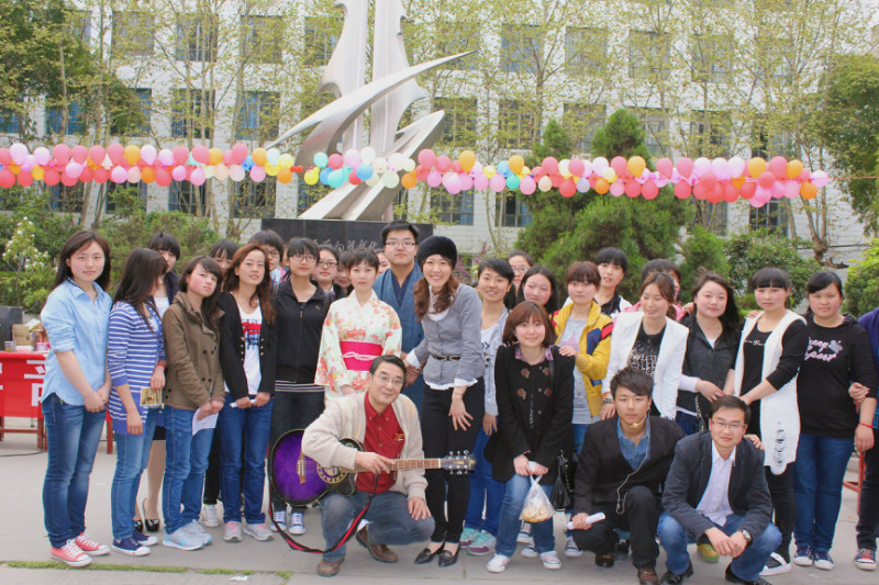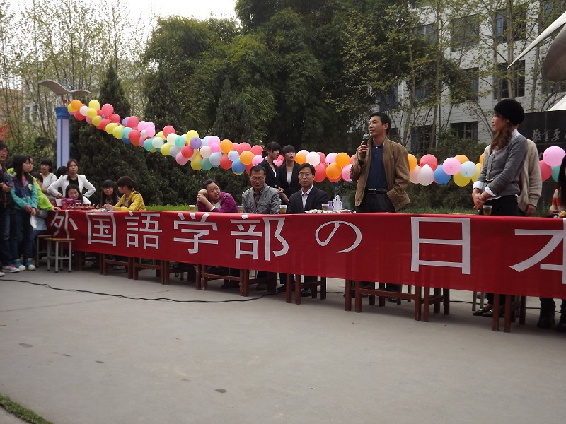 29日下午,文化广场上悬挂着日本式的寿司灯笼,展示了日本传统的竹马,竹筒喷水,人偶等道具,并有身着和服的学生模特,吸引了大批学生和老师前来观看。下午四点半文化广场活动正式开始,李延福书记做了开场发言,鼓励今后多开展这样的活动,增加学生对日本及日本文化的体验和了解。之后日籍教师赤松秀夫和海道千春演唱了《ドラえもん》等日文歌曲,日语专业学生合唱日文歌,然后进行了抢凳子、两人三足吃寿司、踩报纸答题等趣味性的活动。参与活动的人员均有日本式的礼物相送。与此同时,活动现场的嘉宾和观众喝日本式的汤「豚汁(とんじる)」,吃寿司,体验了日本的饮食文化。