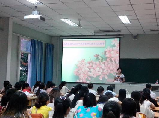 为配合我系英语教育2011级和英语2010级师范生教育见习活动,提供与基础英语教学一线教师交流的平台,6月3日晚上,应我系邀请,在10号教学楼1024教室,汉滨初中初一骨干英语教师张静,为我系即将参加教育实习的英语师范生做了一场关于中学英语教学和班务管理的专题讲座。