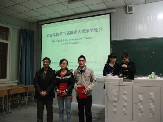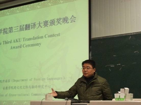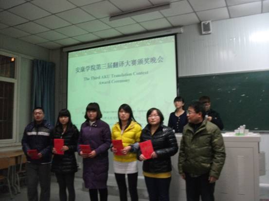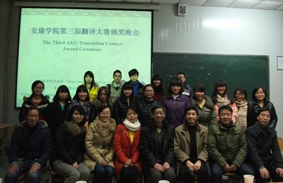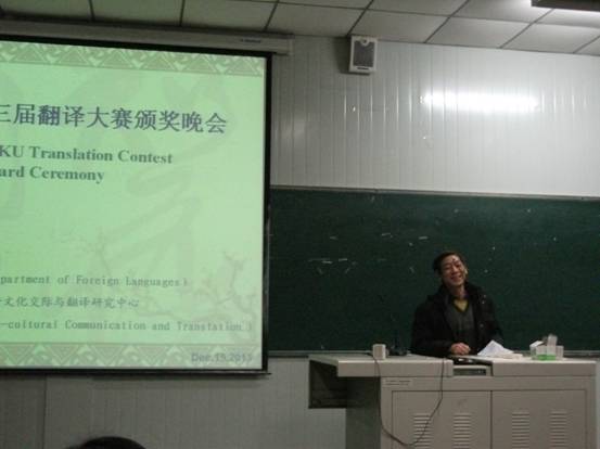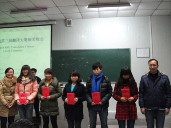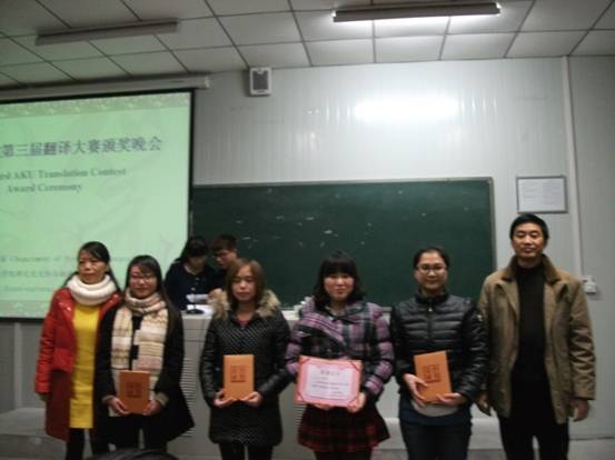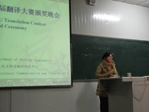 2013年12月19日晚,yl6809永利官网第三届翻译大赛颁奖仪式在江南校区顺利举行。莅临本次大赛颁奖仪式的嘉宾有永利官网特聘教授邹先道教授,外语系李延福书记、“五联共建”支部学校组织部副处级组织员于咏梅老师、大学英语教学部主任李继平,外语系副主任张哲华以及翻译课程群任课教师。
