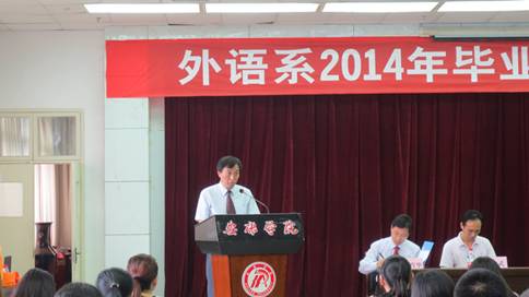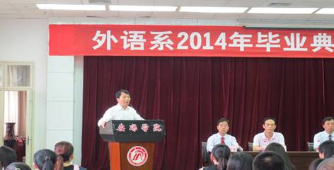接下来,在热烈的掌声中,校党委副书记胡鸿晓教授代表校党政班子发表讲话。在讲话中,他首先向外语系的全体2014届毕业生顺利毕业、走出校门、奔赴祖国建设各个岗位去建功立业表示了热烈祝贺和深情祝福。接着,他以生动真挚的话语,回忆了毕业学子们在校园里勤奋学习、修德练能、茁壮成长的许多感人画面,也表达了对学生服务不周、支持不够的歉意,更表达了对他们携怀母校师恩、放飞青春梦想、开创幸福人生的殷切希望和美好祝福。