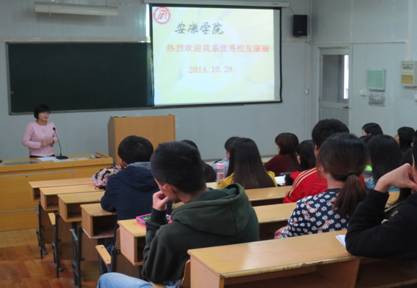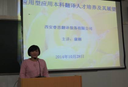 10月28日下午,西安睿恩翻译公司高级项目经理、我系外聘双师型教师康丽为2012级、2013级英语专业翻译方向学生做专题讲座。康丽女士围绕翻译行业前景、翻译行业规范、翻译公司工作流程、译员职业素养等内容进行了讲解,并结合翻译业务实例和同学们展开互动交流。