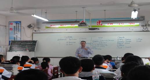 Frank Paul Roppo先生先后与汉滨初中七年级四个班级学生和老师近200余人进行了主题为“中美文化差异”的近距离交流互动。Frank 从风趣的自我介绍开始,深深地吸引住了在场学生。然后他从文化的概念入手,以举例和打比方的形式引导学生积极总结中美文化差异的主要方面。同学们听课认真,努力思考,充分发挥自己的想象力,踊跃发言,答案精彩纷呈,场面热烈。