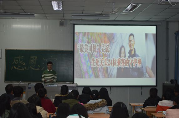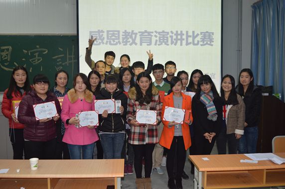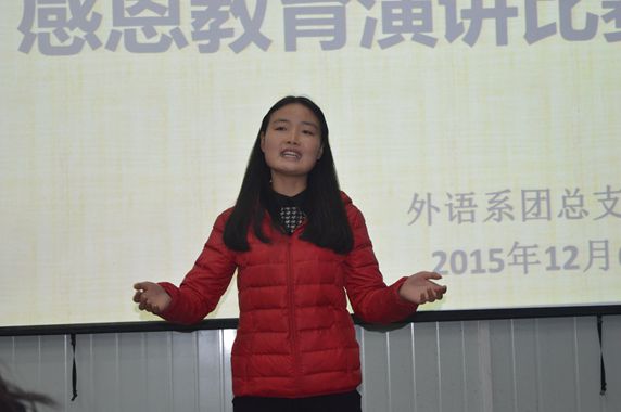 为让学生们学会感恩,表达心声,外语系于12月6日晚在1017教室举办了主题为“让感恩伴随生命”的感恩教育演讲比赛。共有13名学生参加了演讲,外语系团总支书记任森龙、团总支委员及全体2015级学生参加了本次活动。