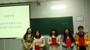 为促进我系各年级翻译方向学生相互交流、学习,以及不断提高自我翻译素养,20151217日晚730,在江南校区十号教学楼1012教室顺利举办了由外语系主办的暑期翻译专项训练总结大会。本次大会由翻译课程群教师陈蕾、焦育玲、彭方圆、胡青松,王刚等5位老师组成评委组,英语13级、14级英语翻译方向各个专项考核优异的同学参与了本次大赛。大会以专项比赛的形式进行,历经书法、仿说、译评、口译等环节的激烈角逐,最终评出韩茹冰、刘靖茹、杨清凇等17名学生进行颁奖和表彰。