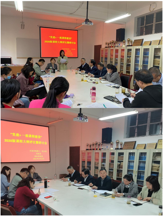 为进一步学习贯彻习近平总书记在党史学习教育动员大会上的讲话精神,落实学校党史学习教育动员部署安排会议精神,以高质量党建促进高质量发展,推动党建质量全面创优、全面提升。yl6809永利官网教工一党支部以培育创建党建工作样板党支部为契机,充分发挥基层党组织的战斗堡垒作用和广大党员的先锋模范作用,深入推广“党建+X”和“五联五做”工作模式,使党的建设与教育教学工作深度融合。4月22日下午,yl6809永利官网教工一支部在6109会议室开展“党建+一流课程建设”2020版课程大纲评比暨研讨会。yl6809永利官网班子成员、教学督导、教工一党支部全体党员、英语系、商务英语系全体党员和教师参加了本次活动。学校党委副书记胡波以普通党员身份参加了本次活动。活动由教工一支部书记陈玉平主持。