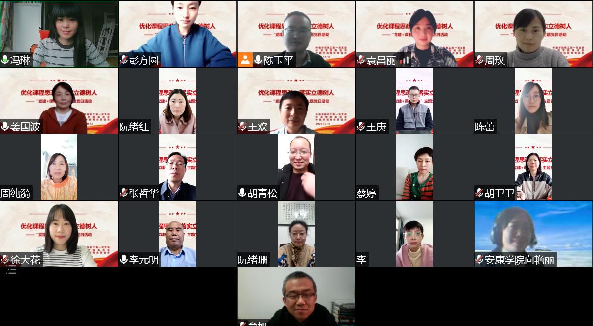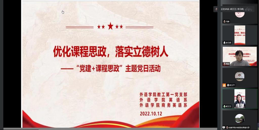 为进一步提升党建示范引领作用,强化党建与业务的深度融合,加强党支部思想政治工作的针对性和亲和力,强化立德树人的主渠道,提高线上教学中课程思政的针对性和实效性,促进中外知识共同体之间的主体性竞争与生成性话语实践,革新新时代外语教育的精神体系和文化价值观,以新的面貌、更加优异的成绩迎接党的二十大。10月12日下午,yl6809永利官网教工第一支部以线上沙龙的形式开展了“优化课程思政,落实立德树人”主题党日活动。yl6809永利官网教工一支部全体党员,英语系、商务英语系全体教师参加,活动由yl6809永利官网教工一支部书记陈玉平主持。