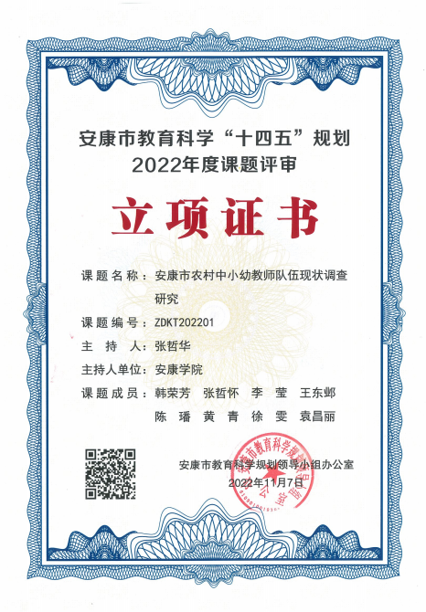 近日,安康市教育科学规划领导小组办公室公布了安康市教育科学“十四五”规划2022年度课题评审立项名单。我院院长张哲华主持的“安康市农村中小幼教师队伍现状调查研究”获重点课题立项。